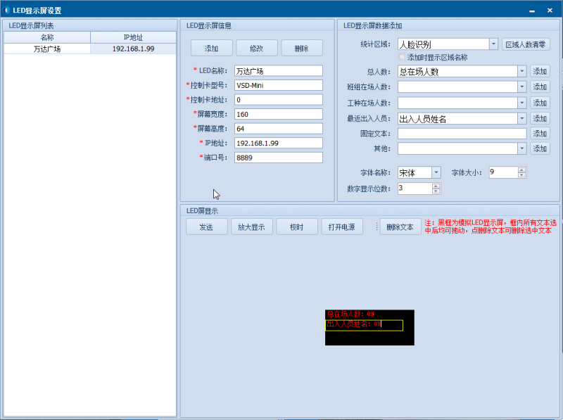 在LED显示屏栏添加显示内容和字体,LED屏显示栏黑色框为LED显示屏,框内所有文本选中均可拖动,点击删除文本可删除选中文本,设置好后点击发送按钮就可以显示相关内容,如下图。