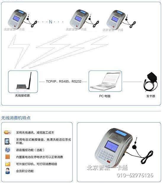 无线传输说明分析: 1. ZigBee中继无线传输模式只需要在办卡服务中心的PC电脑上安置无线信号接收器,然后分别在不同的消费窗口安置无线中继器刷卡机,无需布置信号线,即可实现数据的实时传输与交互,“中继无线触屏刷卡机”采用多信道、信号放大、刷卡机就是信号发射源的多途径信号覆盖传输,如上图:每一个机器都是一个发射源 、机器与机器、机器与基站、基站与基站之间都可以组网形成整体的局域网,实现信号的全面覆盖,从而达到信号没有死角。而且中继器无线刷卡机还支持U盘数据才采集、参数的设置,只需要把做好文件的U盘插在刷卡机上,几秒钟就可以设置好所有的参数,并采集消费数据、挂式黑名单等。也支持RS232传输。 2. 刷卡机键盘为钢琴烤漆的触屏键盘、防水耐用,屏幕能够同时显示卡的余额、当前消费额、当天的消费总额、消费总次数、语音播报消费信息、支持外接打印机。支持语音音量的自定义大小,在系统表表中能查询各种消费信息、消费明细、充值等信息。数据库支持SQL2000\SQL2005\SQL2008.数据双重备份,安全快捷。 3. 最大优点:可无限嫁接中继器达到信号全覆盖,多信道传输、防止信号通道堵塞,机器就是信号发射源、U盘采集、语音播报,数据双重备份。 如图三:单一无线传输模式
